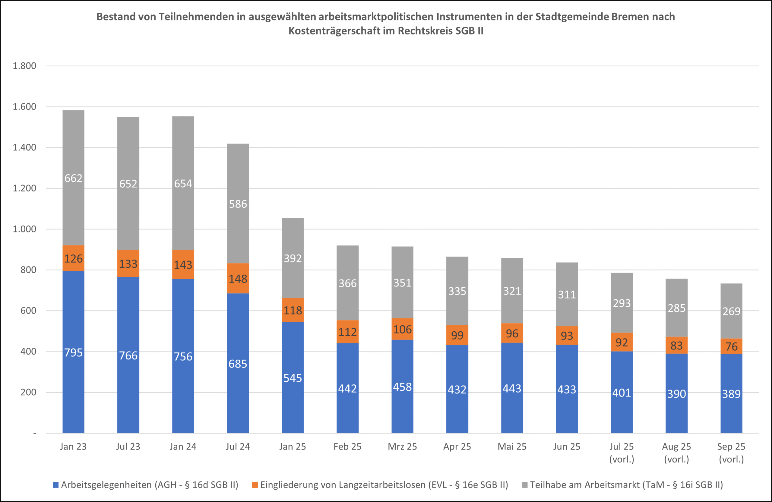 Aktuelle Zahl der in öffentlich geförderter Beschäftigung befindlichen Personen (SGB II − Bestand) einschließlich September 2025. [Quelle: Statistik der Bundesagentur für Arbeit (BA)].