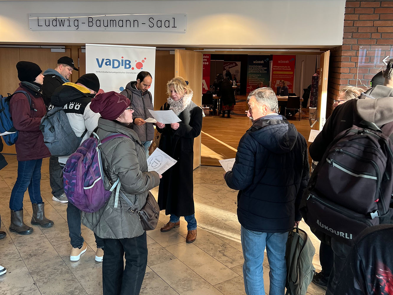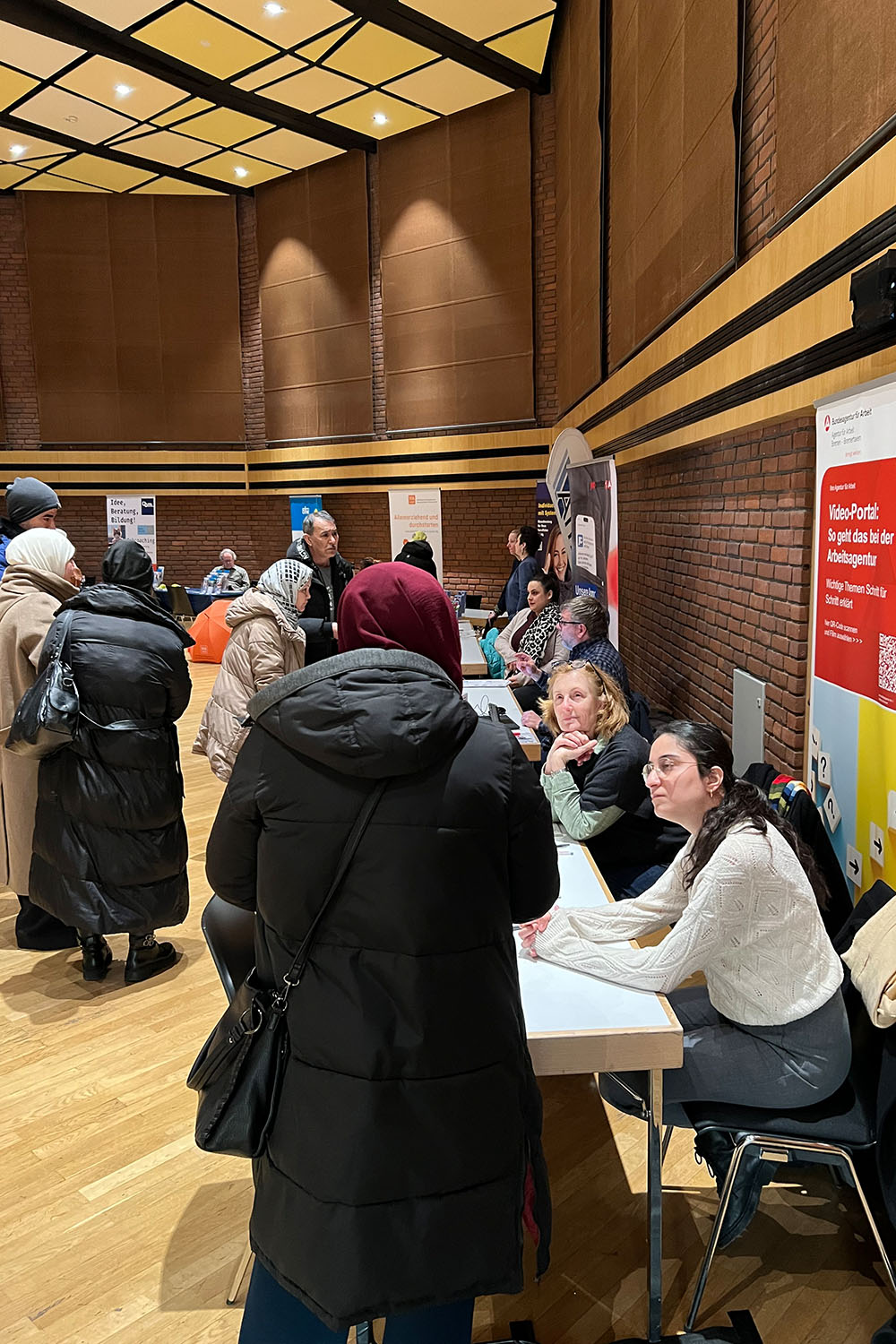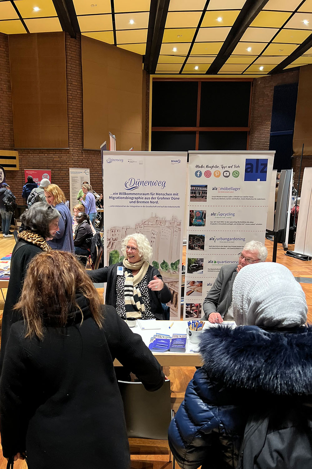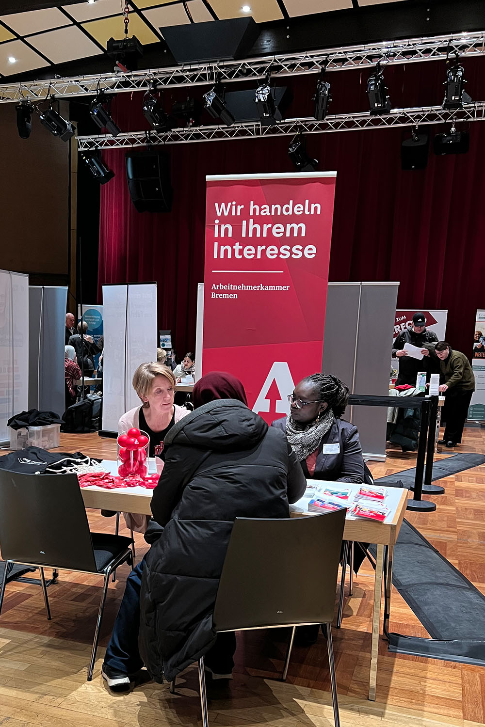 Die Messe „Qualifizieren für Beschäftigung“ im Gustav-Heinemann-Bürgerhaus in Vegesack war inzwischen die elfte Veranstaltung in diesem Format. Die dezentrale Messe hat sich inzwischen etabliert. Insbesondere für Arbeitslose, Menschen mit Migrationshintergrund oder Schutzsuchende ist der Weg zu einer zentralen Veranstaltung weit außerhalb ihres Quartiers oft eine zu große Hürde. Für ausstellende Organisationen bietet dieses Messeformat eine Plattform für Gespräche mit interessierten Menschen im Stadtteil.